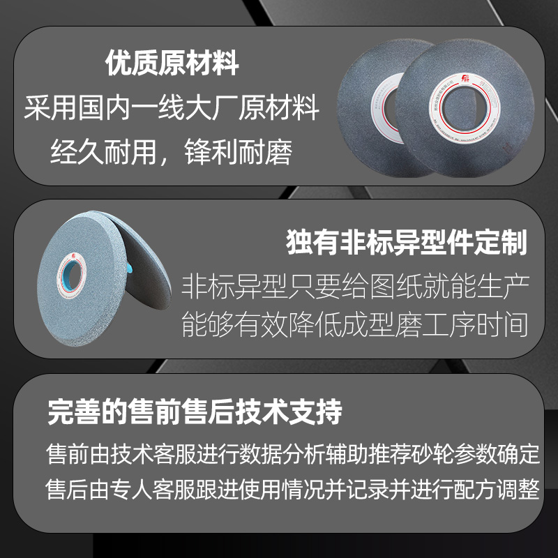 1、磨料:棕剛玉(A)、白剛玉(WA)、鉻剛玉       (PA)、綠碳化硅(GC)、黑碳化硅(C)等。