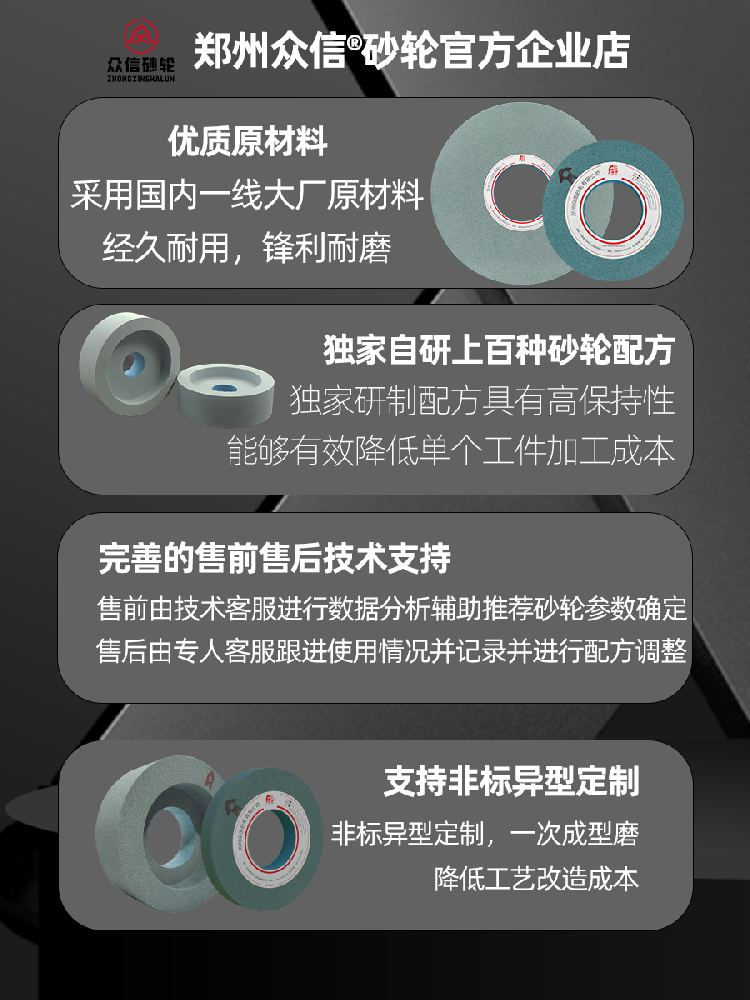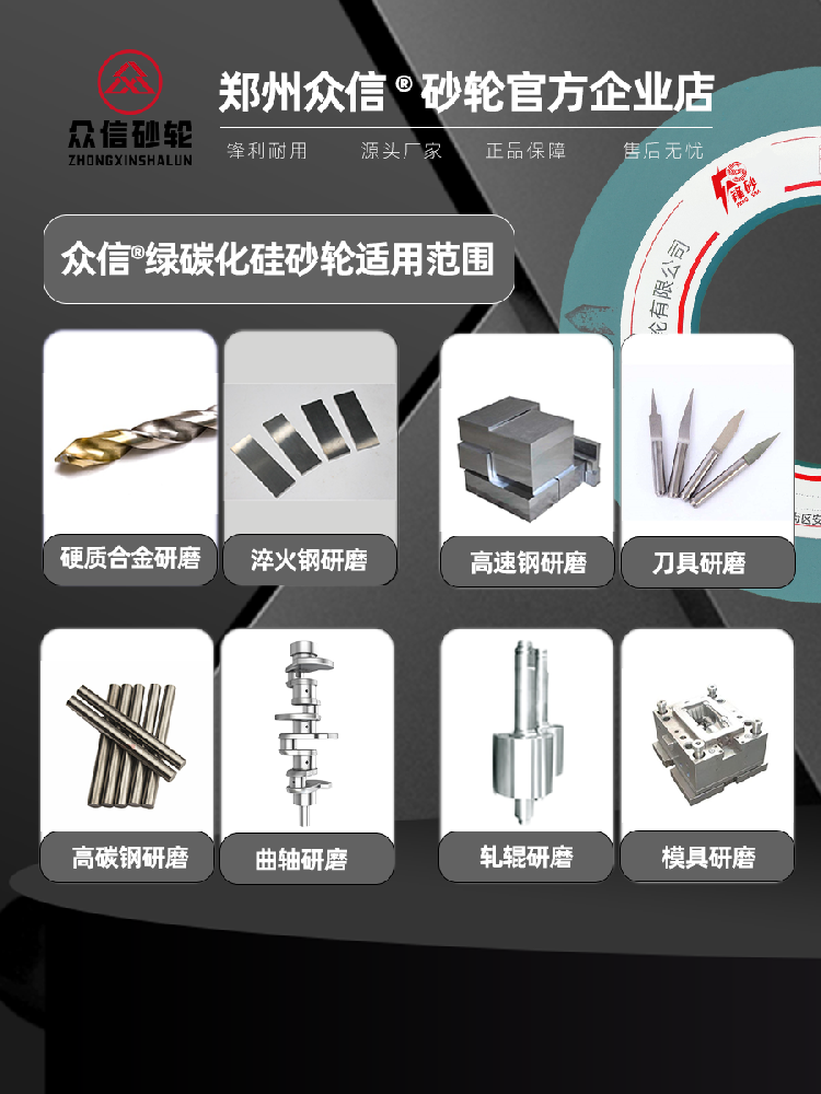 1、磨料:棕剛玉(A)、白剛玉(WA)、鉻剛玉 (PA)、綠碳化硅(GC)、黑碳化硅(C)等。